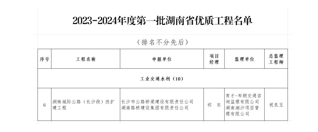 近日,湖南省建筑業(yè)協(xié)會(huì)揭曉了“2023-2024年度第一批湖南省優(yōu)質(zhì)工程”的評(píng)選結(jié)果,長(zhǎng)沙路橋承建的洞株城際公路(長(zhǎng)沙段)改擴(kuò)建工程獲評(píng)“湖南省優(yōu)質(zhì)工程”。